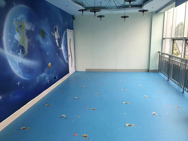 2.幼儿园室内专用PVC地板100%纯PVC耐磨层,厚度达1.5mm,并经防老化和紧固技术处理,耐磨耐压,使用寿命可达5—10年。